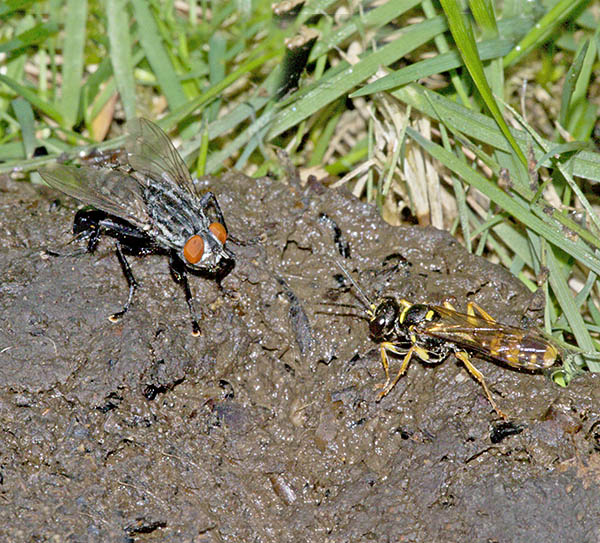 The Mellininae subfamily is small. In fact with Mellinus crabroneus not seen in Britain since 1952 (the species was widespread but never common in the years leading up to the extinction), Mellinus arvensis (15mm) is the only member. The latter is certainly common and, as regards the female at any rate, a fairly large species whose tell-tale burrow diggings are found principally in sandy areas. Relative to the female the male is one of the smallest of all British wasps, as the The burrow, which is up to 40cm long, is excavated pretty quickly. There are a fair number of cells and the prey are medium-sized flies, which are caught in pretty quick succession - six a day at least. Piles of mammal dung are a popular site for females to lie in wait. The female wasps defend their nests vigorously against attempts by others to intrude. Sometimes brief but ferocious fights can occur. The active period of Mellinus arvensis seems to be growing longer with milder autumns, as observations in October and November 2005 confirmed. In July and August, a few were nesting in partial shade beneath the vegetation on the upper bank of the sandpit. In October, up to ten nests were present in a cone-shaped alcove in the bank facing south-west and receiving full sun at that time of year from midday to By November, three Mellinus arvensis were still nesting in the alcove and one remained active until November 19, including on days when the overnight temperature was at or below freezing and the day-time temperature did not reach 7C. One female caught prey on days when the maximum temperature was only around 11C, confirming the known fact that Mellinus arvensis (and Crabro cribrarius) can fly and forage in lower temperatures than almost any other solitary wasps in Britain. Oddly, they are not endothermic, yet the study wasps did minimal basking before flying away. Perhaps predictably given the temperatures, the wasps' efficiency evidently was lower in November than in October - one fly caught in a day, compared with four in the space of two hours on an afternoon towards the end of October when the On two other occasions sizeable flies were caught but the wasps proved unable to transport them to the nest. They seemed to abandon the attempt, eat part of the abdomen for between two and three minutes then leave the flies, one of which was taken away by a passing ant. (On another occasion an ant scavenged an earwig - both times the prey had to be taken up a vertical bank measuring 70cm.) There is little doubt that Mellinus arvensis is increasing in numbers nationally - there were getting on for 100 nesting females at the sandpit in 2007 and almost as many in 2008 and 2009. Given its adaptability and effectiveness at a time of year when there is minimal competition, the continuing success of the species should be assured. Images © Jeremy Early. All rights reserved. In 2013 I published My Side of the Fence - the Natural History of a Surrey Garden. Details may be found, and orders placed, via this hyperlink My Side of the Fence. In November 2015 Surrey Wildlife Trust published the atlas Soldierflies, their allies and Conopidae of Surrey, jointly written by David Baldock and me. Details are on this web page: Atlas. |