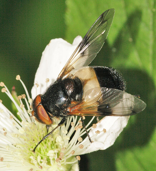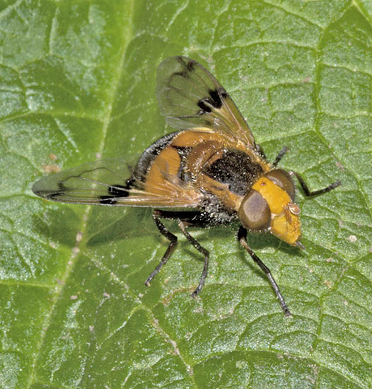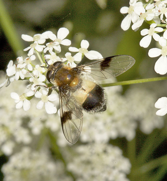 There are more than 6,700 species of fly in the UK, and with 270 species Syrphidae (hoverflies) form a pretty small fraction of the whole. Some, such as Criorhina ranunculi, which is shown on the Dead Wood page in this section, have a conservation designation due to their scarcity but there are plenty which are common. They are better known than most flies because of their often bright colouration, distinctive flight and habitual presence wherever there are nectar- and pollen-producing flowers, including in gardens. Different species, both as adults and larvae, feed on different organic matter ranging from dung to fungi via plants and other invertebrate larvae. A number are bumblebee or wasp mimics, which directly assists in the life cycle of a handful and gives some protecion to all against attack by predators. Most of the species shown on this page exemplify this. From the same genus as Criorhina ranunculi and commoner though still not exactly two a penny is Criorhina floccosa (16mm), a fine bumblebee mimic whose larvae develop in trees. The adults are seen mainly in June and July. Members of the Volucella tribe are large and obvious, with one exception mimicing Volucella bombylans (24mm) has two colour forms mimicing different bumblebees - bombylans and plumata. Volucella inanis (22mm), which is expanding its range northwards from the home range of the London area, is associated with Hornet (Vespa crabro) and German Wasp (Vespula germanica) nests. The impressive Volucella zonaria (35mm), a Hornet mimic and our largest hoverfly, has colonised Britain from Europe since 1940 and is spreading quite rapidly. Warmer climatic conditions are helping this development. The member of the clan which bears little resemblance to any aculeate is Volucella pellucens (22mm), with its distinctive black and white markings. Despite the seemingly unhelpful appearance, the larvae of this species reside in the nests of social wasps. The adults have a noted preference for bramble flowers. As a point of interest, in just a couple of days in June 2007 the relatively small section of a public park where the accompanying image was taken also saw three other types of Volucella, Criorhina floccosa and such aculeates as the bee Andrena florea, digger wasp Argogorytes mystaceus, cuckoo wasp Nysson spinosus and spider-hunting wasp Priocnemis perturbator. Leucozona lucorum (12mm), which has very similar markings to Volucella pellucens, is frequently found in lush vegetation. Xylota sylvarum (16mm) is a common and fairly large species whose larvae live in the decaying roots of beech or fir, while the chunky Myathropa florea (15mm), which peaks in August, lays its eggs near damp or rain-filled spots in trees. They are similar in markings to Eristalis species Baccha elongata (8mm) is a common hoverfly of woodland edge. The abdomen has an obvious waist and is unmistakeable. Helophilus pendulus (12mm) is the commonest hoverfly seen around wetlands but may be found in any habitat which has a wet element, including woodland. Noisy fliers, they are evident for much of the year but most frequent in July and August. The rat-tailed larvae have been found in shallow water, manure and wet sawdust. Callicera aurata (13mm) is a bonny and nationally scarce hoverfly, one with distinctive white tips to the antennae and a bronzy abdomen covered in golden hairs. The species is very sporadic in appearance but has been seen in plenty of locations and its larvae also live in water-filled cavities in trees. Epistrophe eligans (10mm) and Rhingia campestris (12mm) are commonly found on woodland edges. The latter, whose long snout assists it to nectar in deep flowers - the pictured example is on Penstemon in a garden - uses dung, principally from cows, for breeding. Its close relative Rhingia rostrata is less common and the breeding requirements are uncertain though there may be an association with Badger latrines. Another large species, Scaeva pyrastri (16mm), is principally a Chrysotoxum cautum (14mm) is the largest of the eight yellow-coloured members of the Chrysotoxum genus in Britain, all of which are good wasp mimics, and is easily identified in the field by its markings and broad abdomen as well as size. Scrubby areas with grass and/or trees suit this one as well as Chrysotoxum festivum (12mm) and Chrysotoxum bicinctum (12mm). These species are all on the wing from May to September and visit a wide range of plants for nectar, a comment that applies equally to Xanthogramma pedissequum (12mm), though this species does tend to fly and forage closer to the ground. Larvae are associated with nests of Lasius sp ants. Finally, Ferdinandea cuprea (11mm), which is widespread and distinctively marked but is noticed less than many species because it tends to rest and bask on wood or leaves rather then on flower heads. The pictured female was a useful exception to this rule. Cheilosia is the most numerous hoverfly genus in Britain and the tally has increased in recent times with the arrival from mainland Europe of Cheilosia caerulescens (10mm). The larvae of this species eat House Leeks so it is a rare example of a hoverfly that can be a nuisance for gardeners. The bumblebee mimic Cheilosia illustrata (12mm), a more colourful species than most Cheilosias, is not infrequent. The best place to look is on Hogweed flower heads. Eristalis intricarius (12mm) is another bumblebee mimic and one that is widespread, often found in dampish habitats. Didea fasciata (12mm) and Sericomyia silentis (14mm) are each a fair size and somewhat less common. Images © Jeremy Early. All rights reserved. In 2013 I published My Side of the Fence - the Natural History of a Surrey Garden. Details may be found, and orders placed, via this hyperlink My Side of the Fence. In November 2015 Surrey Wildlife Trust published the atlas Soldierflies, their allies and Conopidae of Surrey, jointly written by David Baldock and me. Details are on this web page: Atlas. |