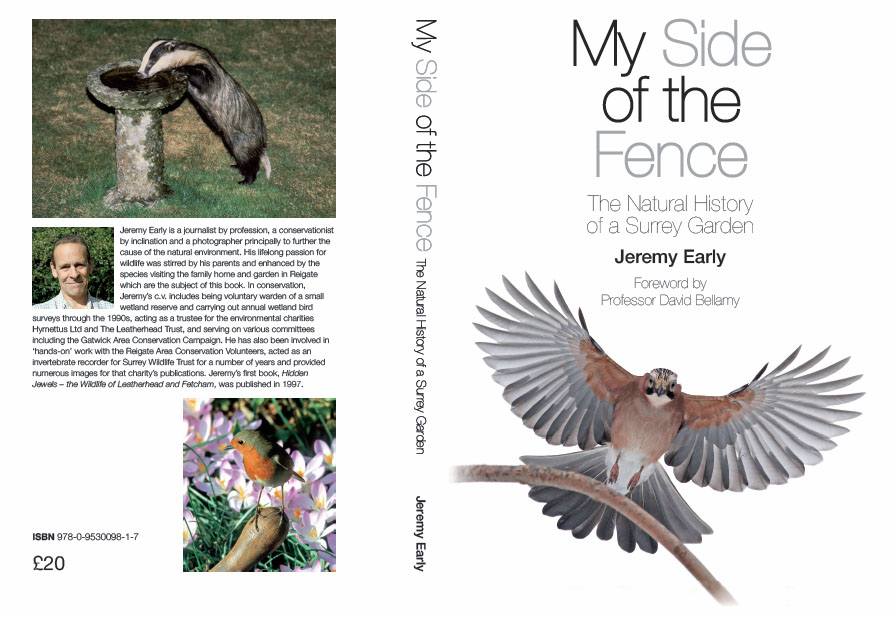 Britain's wild places host a remarkable variety of beautiful fauna but they are not the only locations boasting such richness. The private nature reserves better known as gardens also attract species galore, many of them often unnoticed. With wildlife coming under pressure in so many places, these havens have the potential to play an ever-increasing role in nature conservation. Books on the wildlife found in gardens are almost two a penny nowadays but very few of them focus on individual gardens with their ups and downs, showing the species that live there or visit. Even fewer pay much attention to species beyond the obvious 'cuddly' ones led by mammals, birds and butterflies. Published in 2013, My Side of the Fence - the Natural History of a Surrey Garden sets the record straight by putting in clear focus the wealth of wildlife seen in a family garden in Reigate over the last 50 years. In hardback and measuring 170mm x 240mm, the 256 pages, with a Foreword by Professor David Bellamy, contain over 500 colour photographs of 350 species ranging from large mammals to tiny bees, wasps, flies and beetles. Accompanying the images are full lists of species recorded, including 13 mammals, 53 birds, 22 butterflies, 82 bees, 77 wasps and 58 hoverflies. A good proportion of these are scarce locally or nationally. There are also details of observed behaviour, analysis of population changes and suggestions about how wildlife may be drawn into a garden. My Side of the Fence offers a unique and eye-opening opportunity to anyone who cares about wildlife or gardens. Copies are available in the United Kingdom at £20 plus £3 postage and packing from Jeremy Early at 30 Park Lane East, Reigate, Surrey RH2 8HN. For purchasers in the Republic of Ireland or mainland Europe, the price of the book is 24 euros, plus postage and packing. Please e-mail My Side of the Fence with your details and any queries. Cheques or postal orders should be made payable to Jeremy Early and sent to the address above. Payment may also be effected by card through PayPal, providing I have your email address for invoicing purposes. No personal information from anyone contacting me will be shared with other agencies. For every sale, £1 will be donated to Surrey Wildlife Trust. Images © Jeremy Early. All rights reserved. |