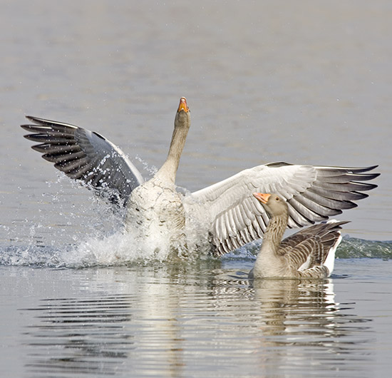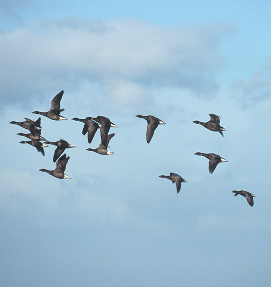 Lowland England is nothing like so well off for geese as the north, and wherever you go on the coast the winter always provides the best opportunity of seeing different species. Barnacle Geese (Branta leucopsis), Greenland White-fronted Geese (Anser albifrons flavirostris) and migratory Greylag Geese (Anser anser) winter principally in Scotland, and most of the world population of Pink-footed Geese (Anser brachyrhynchus) are also in the north. But the south plays host to a third of the world population of Dark Bellied Brent Geese (Branta bernicia bernicia, wingspan 110cm), around 70,000 Pink-foots and a few hundred Bean Geese (Anser fabalis). The Wash and the Norfolk coast are the best places for both Pink-foots and Brent, with roughly 30,000 of the latter, though there are also good numbers of them on most other estuaries in the south-east. They rely almost entirely on Eel-grass (Zostera) for food. Brent Geese breed in the Arctic tundra of Russia and The only native breeding goose in the south is the Greylag (wingspan 170cm), a handful of which winter on the coast here having bred in northern Europe. Greylags are mostly inland in the south. Descended from domesticated birds, they are large and powerful, much chunkier than the introduced Canadian Goose (Branta canadensis, wingspan 175cm). Cross-breds result from some Greylags breeding with Canadian Geese. The progeny are much tougher and more aggressive than either of the parent species, which is saying something. Whether this is an example of hybrid vigour is debatable, but either way the pictured cross-bred gave a bad time to a pair of Canadian Geese and a pair of Greylags at the WWT Wetland Centre in London in the spring of 2005. With their resonant, honking calls, large numbers (70 is a common size for a flock) and readiness to come and be fed by people Canadian Geese - essentially an inland species - are very familiar. Sadly, as with the Grey Squirrel (Sciurus carolinensis), this seriously impairs effective management of the species, which is non-native and has had an impact on native birds in some places. Canadian Geese arrived in the 17th century but it is in the last 30 years that they have really got going. Images © Jeremy Early. All rights reserved. In 2013 I published My Side of the Fence - the Natural History of a Surrey Garden. Details may be found, and orders placed, via this hyperlink My Side of the Fence. In November 2015 Surrey Wildlife Trust published the atlas Soldierflies, their allies and Conopidae of Surrey, jointly written by David Baldock and me. Details are on this web page: Atlas. |