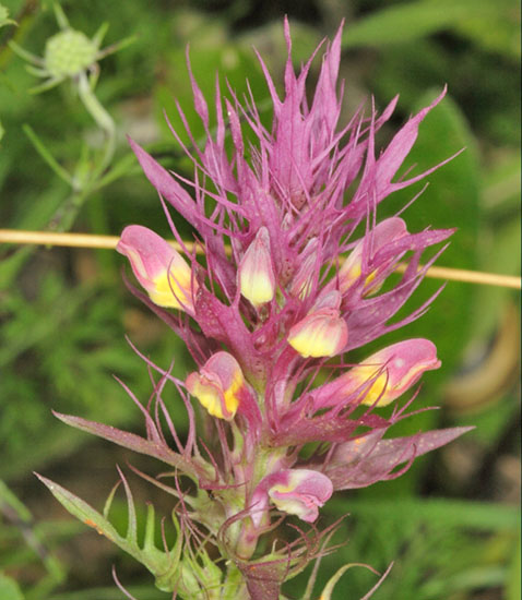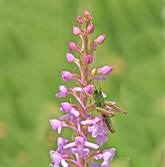 Unimproved calcareous grassland is a tough habitat but a rich one for flora, much of which hugs the ground to fit the soil conditions and effects of the wind. This aims to be a representative selection. The handsome and stately Meadow Clary (Salvia pratensis) is not only one of the most striking downland flowers visually - it is also one of the rarest, with 'near-threatened' status. They flower in June and July and are found at only around 20 sites in Britain, mostly on the North Downs and in Oxfordshire. Field Cow-wheat (Melampyrum arvense) is also a plant of calcareous grassland and an even scarcer one, classified as endangered. Never very common in Britain, it is found in only a handful of places nowadays, in Wiltshire, Bedfordshire and on the Isle of Wight. Field Cow-wheat flowers from June to September and is a hemi-parasite, gaining nutrition from other plants to which its roots are attached. Clustered Bellflower (Campanula glomerata) is related to Harebell (Campanula rotundifolia) but is much vivider in colouring and much less widespread - it is a downland plant par excellence, flowering until well into autumn. At the other end of the flowering period, Cowslips (Primula veris) are a fine sight in spring and appear to be increasing. The plant species most closely associated with the habitat, though, and the one which packs human visitors in like no other, is the Orchid. Orchids are handsome and artistic, in the sense that they can resemble anything from insects to monkeys, reptiles and soldiers. They are also mysterious, Warmer summers may well encourage Orchids to flourish - the Lizard Orchid (Himantoglossum hircinum) was thought extinct in 1900 but then expanded in the warm period 1920 to 1940 before contracting again when it grew colder, then tripling to more than 3,000 plants from 1988 to 1994. June is the best month to see Orchids, and in a good year, such as 2004, the downs can be alive with them. Among the commoner ones are the Common Spotted Orchid (Dactylorhiza fuchsia), which is at home in various other habitats, the Pyramidal Orchid (Anacamptis pryamidalis), the Fragrant Orchid (Gymnadenia conopsea) and the Bee Orchid (Ophrys apifera). Both the latter two species can be found in damper places as well, but they are in their element in short turf on lime or chalk. Bee Orchids, which originally were designed to attract bees for pollination as happens in the Mediterranean but are now self-pollinating, can turn up in hundreds, often in unexpected spots such as roundabouts. Whether they repeat the performance the year after, or wait a lot longer, is never certain. Man Orchids (Orchis anthropophorum) are not quite so common, found most easily on the North Downs in Kent, and the White Helleborine (Cephalanthera damasonium), like nearly all of that particular genus, is associated with woodland. The pictured plant, along with a number of others, was photographed in the open on the North Downs near Dorking but there is woodland nearby. Meadow Grasshoppers (Chorthippus parallelus, 18mm) are among species of grasshopper and cricket that use flowers for gaining a good vantage or 'jumping off' point. Orchids are often appreciably taller than the other flora found on downland and are ideal for this. Field Scabious (Knautia arvensis), which can grow much higher, helps perform a similar function and provides a perfect warming-up spot for Common Blue butterflies (Polyommatus icarus, wingspan 35mm) among others as the sun hits a south-facing slope fairly early in the morning. Yellow Rattle or Cockscomb (Rhinanthus minor) is a tremendously useful hemi-parasitic herbaceous annual plant that gains some of its nutrients from the roots of neighbouring plants. Yellow-wort (Blackstonia perfoliata) is a pretty common member of the gentian family found on calcaerous soils and dunes. It needs full sun to thrive; the flowers close when the sun goes in. Yellow-wort is in bloom from June to October. Carline Thistles (Carlina vulgaris) are found mostly on calcareous grassland and do not grow so tall as most Thistles, to 50cm. The flowers look very similar when dead as when in bloom in late summer, and can survive all winter. Self-heal (Prunella vulgaris) is universal, at home in lawns and woods and flowering from June to October, but nowhere does it look better than on downland. Common Toadflax (Linaria vulgaris) is a spreading plant, similar to the well-known Snapdragon in gardens, that grows well on loose, well-drained soil in sun or partial shade. One colloquial term for the flowers is Butter and Eggs. In similar vein, but from a different family (the Fabaceae or pea family) is Birdsfoot Trefoil (Lotus corniculatus). The mixture of yellow and orange petals, leading to the colloquial name Eggs and Bacon, makes the species striking and they can carpet swathes of downland for much of the summer. It is a foodplant of the Dingy Skipper (Erynnis tages) butterfly. Vetches and Trefoils are very successful on calcareous grassland. Among naturalised plants from the same family which sometimes occur on downland, Broad-leaved Everlasting Pea (Lathyrus latifolius) is one of the handsomest and most useful for fauna. It acts as the foodplant for a non-native butterfly that turns up now and then, the Long-tailed Blue, and is decidedly popular with various bee species. Deadly Nightshade (Atropa belladonna), poisonous and from the same family as potatoes and tomatoes, is much less often seen than Woody Nightshade (Solanum dulcamara). Native to the UK only on calcareous soils, it has impressive flowers (30mm) and berries (20mm). Images © Jeremy Early. All rights reserved. In 2013 I published My Side of the Fence - the Natural History of a Surrey Garden. Details may be found, and orders placed, via this hyperlink My Side of the Fence. In November 2015 Surrey Wildlife Trust published the atlas Soldierflies, their allies and Conopidae of Surrey, jointly written by David Baldock and me. Details are on this web page: Atlas.