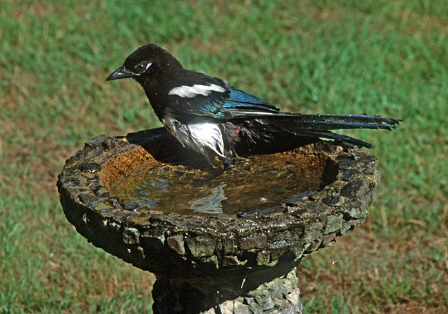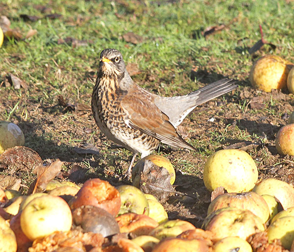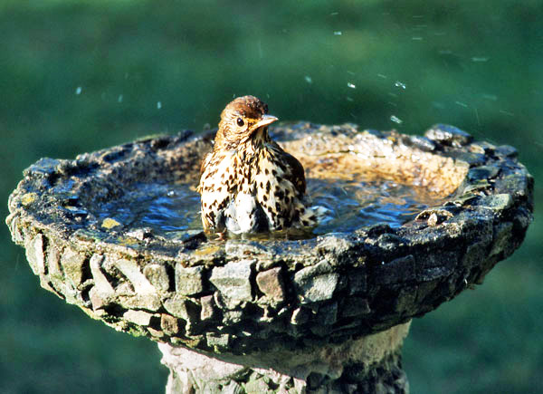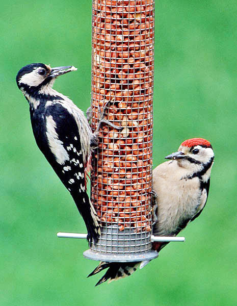 The distinction drawn between nesting and non-nesting birds is entirely arbitrary, since the handful of species shown in this section have all nested close to the garden where the majority of these photographs were taken, but not definitely inside the boundary. Any or all of them might breed in gardens elsewhere. The Song Thrush (Turdus philomelos, wingspan 35cm), originally purely a bird of the ancient forest but one which adapted to live in the much smaller woodlands associated with human settlements, and around the settlements themselves in parks, hedgerows and gardens, has undergone a severe decline in the last 25 years. It is now a bird of high conservation concern under British Trust for Ornithology guidelines. For the record, young Song Thrushes look pretty similar to the adults but as with so many juveniles, their uncertain behaviour tends to give them away as readily as plumage variation. This is clear in the picture just below. The reasons for the decline are unclear. There have been few hard winters in that period and likelier causes are increased use of pesticides and warmer, drier summers. Both play a part, as pesticides can have a bad effect on snails, an essential part of their diet, especially in dry weather when earthworms are harder to find. Song Thrushes also feed on numerous other types of invertebrates and on fruit. In 2015 I saw one provoking ants into jumping on its back and spraying formic acid as a means of removing parasites. This procedure, known as anting, is commonest with Jays but Blackbirds also do it occasionally. Snails can be a problem in any garden where vegetables and border flowers Putting down poison pellets to kill these and slugs, as well as White-lipped Snails (Cepaea hortensis) and Brown-lipped Snails (Cepaea nemoralis, diameter 20mm), is a bad policy when there are much more environmentally sensitive methods available. The pellets contaminate the ground, and can kill mammals and birds as well. Snails are invertebrates and after mating, the female in some species lays up to 100 eggs in the soil, in rotting wood or under logs or stones - almost anywhere providing it is moist and not in direct sun. Adults mostly hibernate and some individuals can live for up to ten years. The reason they go for garden plants, including vegetables, is because in the main those plants are more nutritious and softer than wild plants, and packed close together. Members of the Thrush family which are not seen in lowland England in the summer months but make their presence felt every winter are Redwing (Turdus iliacus, wingspan 34cm) and Fieldfare (Turdus pilaris). Both breed further north, mainly in Scandinavia, but head across the North Sea to find food here when winter starts to bite. Hawthorn berries and fallen apples are among the choicest titbits and squadrons of both species, up to 750,000 apiece across the UK as a whole in cold years, work their way across country devouring these and worms. Other avian woodland visitors to gardens which do not usually breed there include Long-tailed Tits (Aegithalos caudatus, wingspan 18cm), which usually nest in fairly thick cover. The nest is one of nature's great works of art, consisting of a blend of moss and cobwebs bound into a funnel shape; the whole family, up to a dozen birds, can roost within at night, making for a tight fit. Long-tailed Tits tend to move fast and in bands of a dozen or more when feeding in the winter. They will visit garden feeders for a few seconds, then move off, and Goldfinches (Carduelis carduelis, wingspan 23cm) do not breed in the garden but come in now and then for sunflower hearts. They are present year round but another finch, the Siskin (Carduelis spinus, wingspan 20cm), breeds further north and is a winter visitor. Siskins tend to go for peanuts in red feeders, a colour preference which has not been explained. Milder winters seem to have reduced the numbers heading into some parts of lowland England but they are still common. Great Spotted Woodpeckers (Dendrocopus major, wingspan 37cm) have thrived as never before in the last 20 years partly thanks to homeowners putting out peanuts. Their numbers doubled from 1994 to 2004. By comparison, the Lesser Spotted Woodpecker (Dendrocopus minor), only the size of a Robin, has declined badly. Great Spotted Woodpeckers need standing trees in which to excavate their nest holes, helped by the double skull which prevents damage as the ferocious tapping progresses. The nests are often reused or, if abandoned, may be utilised by Nuthatches, but a non-native species, the Rose-ringed or Ring-necked Parakeet (Psittacula krameri, wingspan 65cm) seemingly is having an impact. Natives of Asia and Africa which feed mainly on fruit and seeds, they have had a strong feral breeding population here for 40 years. They, too, nest in tree holes but are larger than woodpeckers, which cannot compete with them effectively, and the fact that they can breed as early as February does not help other contenders for tree space. The Parakeet population is increasing apace, with claims that the figure may quadruple to 50,000 by 2010. This is mainly to the south of London - several thousand have been in the habit of roosting near the Esher Rugby Club in Surrey, making a deafening noise and depositing abundant guano. Possibly they are already a threat, and despite the birds' wonderful plumage and charming social behaviour, the projected increase may prove a dubious benefit if accurate. However, whether culling, which has been mooted, is practicable or desirable is a matter for debate. Great Spotted Woodpeckers are catholic in their diet, going mainly for invertebrates in trees but also seeds plus eggs and nestlings, with the declining Willow Tit seemingly a prime source. By comparison, the Green Woodpecker (Picus viridis, wingspan 42cm), the largest and most colourful of the family in Britain, has a harder task since its prey tends A frequent visitor to gardens, where there are usual