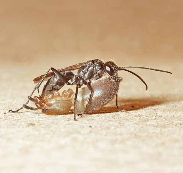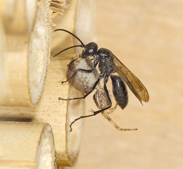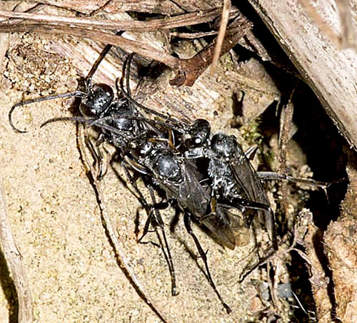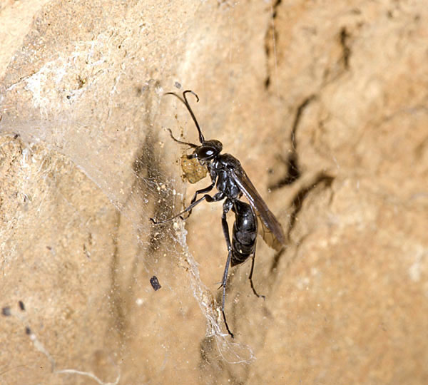 Auplopus carbonarius, a nationally notable species, is one of the most interesting of the Pompilidae because uniquely among the British group it constructs a nest of barrel-shaped cells in which spiders are stored and the larvae develop. About 10mm (male 8mm) in size, the wasps are found from June to August, the male distinguished by the ivory-coloured maculae alongside the eyes. In August 2005 I was lucky enough to see and photograph them mating near a root-plate. Three males effectively lay in wait and when a female appeared they homed in, resulting in a mating frenzy. After the wasps had careered around the ground for more than two minutes, they separated. The female was evidently exhausted, to such an extent that I was able to place her on my finger and leave her there virtually motionless for more than a minute - very unlike the usual intense activity of Pompilidae. The males had another go when she was put down on the root-plate but this time she got away. Auplopus carbonarius need water and soil of one sort or another to construct their cells. In keeping with this, the females which nested behind part of the wood in the root-plate were in almost constant motion ferrying small, damp bundles of sand. One had her nest site above a disused spider's web, across which she readily ran to gain entry. There can be anything up to ten cells in a nest and the prey, a wide range led by Clubionidae, often have their legs amputated to aid carriage. This can be effected by flying, though more often on the ground. Images © Jeremy Early. All rights reserved. In 2013 I published My Side of the Fence - the Natural History of a Surrey Garden. Details may be found, and orders placed, via this hyperlink My Side of the Fence. In November 2015 Surrey Wildlife Trust published the atlas Soldierflies, their allies and Conopidae of Surrey, jointly written by David Baldock and me. Details are on this web page: Atlas. |