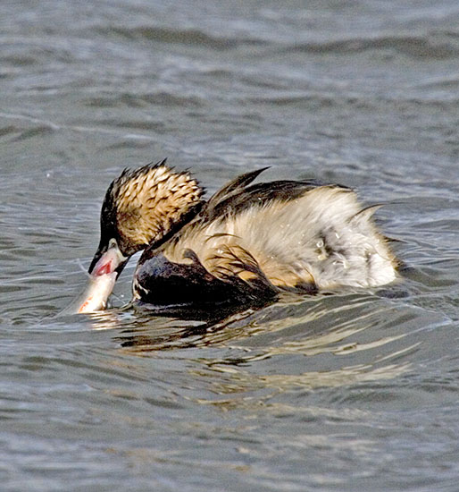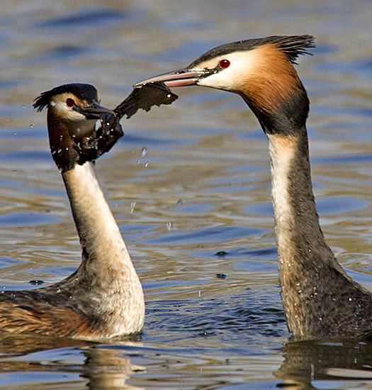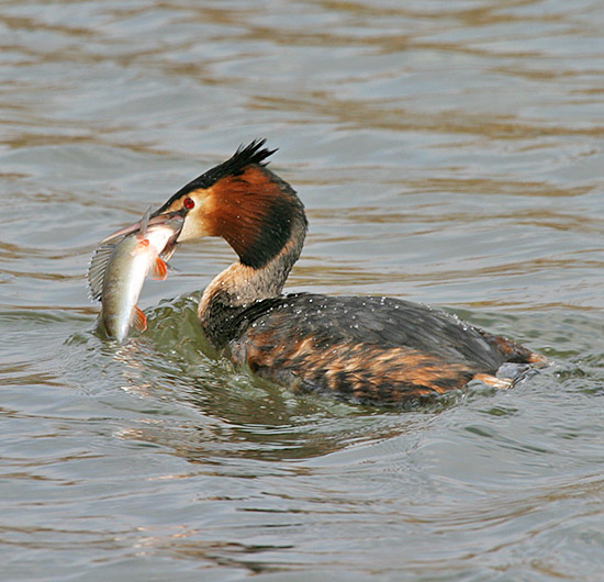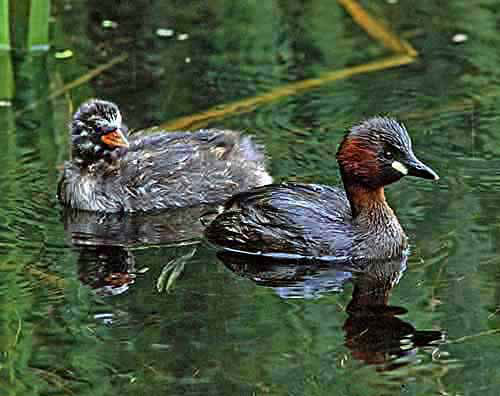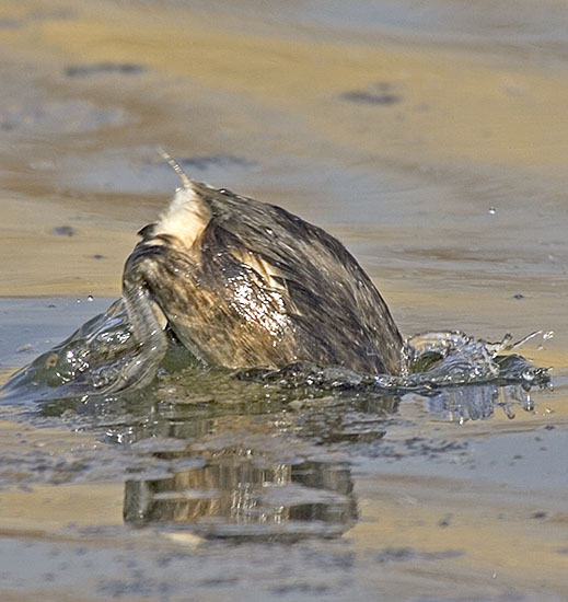 Great Crested and Little Grebes are common, though the former took a terrible hammering from plume collectors, egg collectors and fish farmers until the 1860s, with the result that only around 40 breeding pairs survived in England. Legislation from 1869 to 1880 put a stop to this abuse and the Great Crested Grebe (Podiceps cristatus, wingspan 90cm) has flourished since, helped in recent decades by the creation of reservoirs and of lakes in disused gravel pits. There are now at least 4,000 breeding pairs, most of which depart to the coast for the winter owing to the danger of being frozen in on ponds. Courtship in most birds is not studied so closely as that of Great Crested Grebes, To give one example, in a poorly-managed pond with no aquatic vegetation a pair of the birds was forced to use decaying deciduous leaves for the weed ceremony - proof of their adaptability, and of the sorry effects of lack of management leading to lack of life for flora and invertebrates. Great Crested Grebes are very much water birds, with legs set well back in the way that those of Divers are, making them clumsy on rare visits to the land. Almost any kind of fish, from Minnows (Phoxinus phoxinus) to small Pike (Esox lucius), is caught by diving for less than 30 seconds, but the strike-rate is indifferent, something like one in four. Nests are constructed of almost any available material and are set low above the water, resulting in loss of eggs and chicks when levels rise through heavy rain. As with various waterfowl, youngsters travel on the parent's back for protection for up to two weeks. Little Grebes or Dabchicks (Tachybaptus ruficollis, wingspan 42cm) are much There is something in the region of 8,000 breeding pairs in the UK, though they are not always easy to see, tending to scuttle for cover at the slightest hint of danger along rivers in particular. Little Grebes do not go to the coast in winter, so harsh conditions are bad news, as are too many medium- to large-sized fish in unmanaged ponds, which can eat the food normally taken by the birds. This includes small molluscs, crustaceans, amphibians and insect larvae as well as such fish as Minnows. The dive is a very rapid affair, coming after little or no warning, but the success rate is often better than that of the Great Crested Grebe because of the more varied diet. Most eggs are laid from the end of March, with clutches of around six hatching on a nest consisting of a floating platform of aquatic weeds attached to other vegetation below. Images © Jeremy Early. All rights reserved. In 2013 I published My Side of the Fence - the Natural History of a Surrey Garden. Details may be found, and orders placed, via this hyperlink My Side of the Fence. In November 2015 Surrey Wildlife Trust published the atlas Soldierflies, their allies and Conopidae of Surrey, jointly written by David Baldock and me. Details are on this web page: Atlas. |