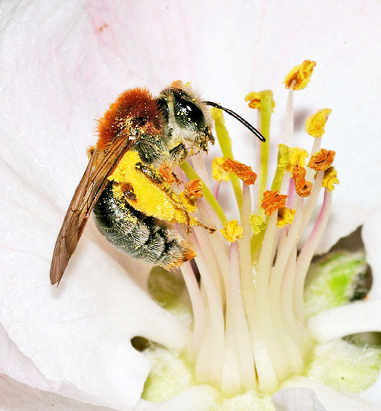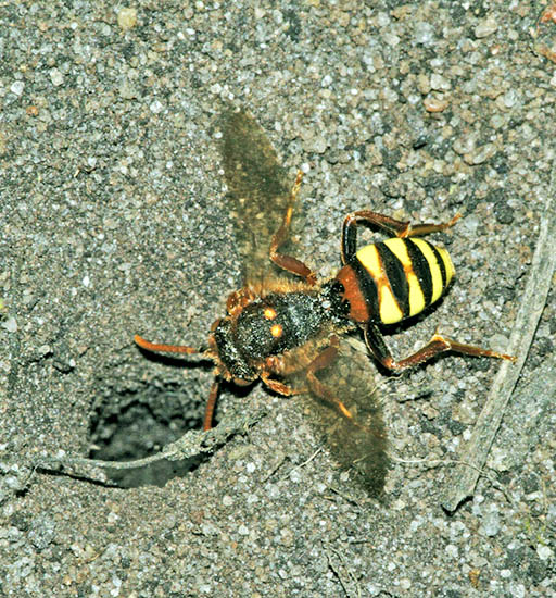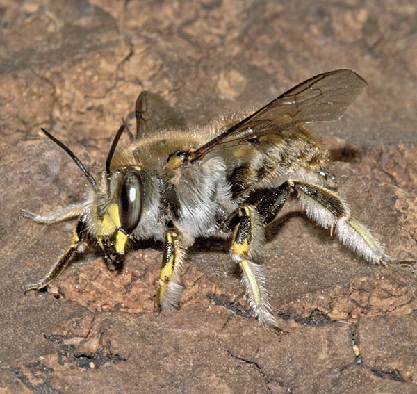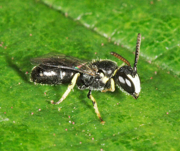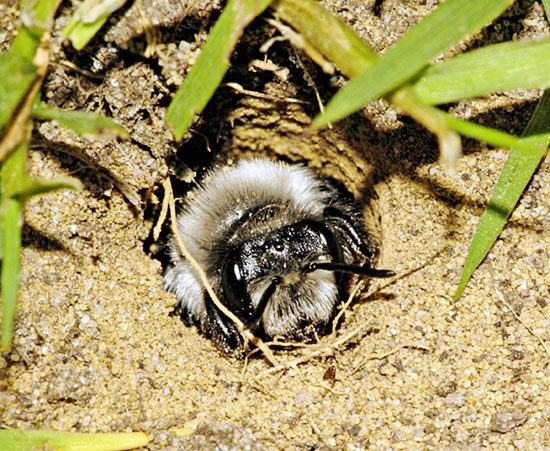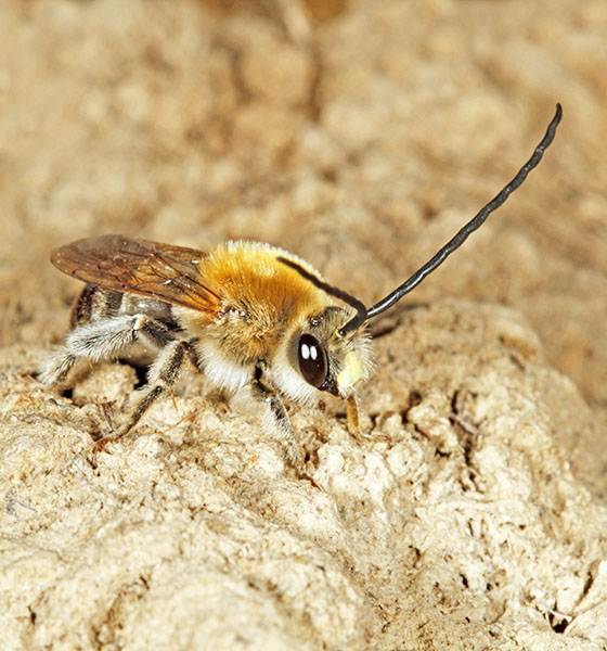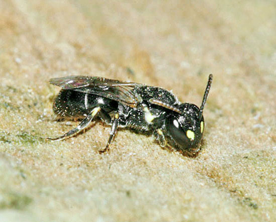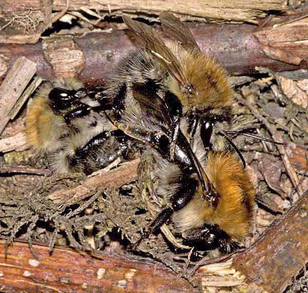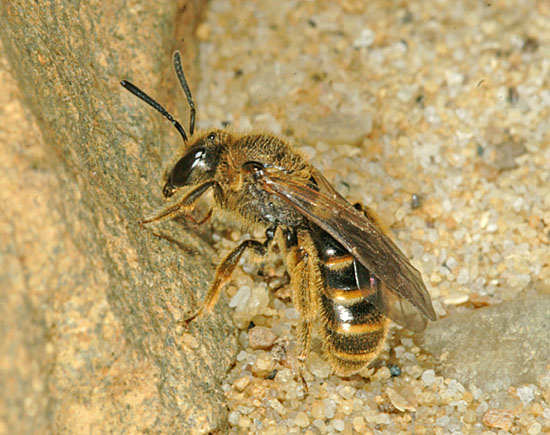 Woodland, hedgerows and nearby grassland which are species-rich in flora are excellent for bees of all kinds and only a fraction of what is a truly massive tally is discussed here. Other pollen-collecting bees are found on the Bluebells page and in particular in the Gardens section of the website, since so many of them offer excellent opportunities for study when they visit borders for nectar or pollen and when they nest. Megachile spp are a case in point. The Nomada genus of cuckoo bees is on a separate page. Bumblebees are easily found and pretty numerous, including Bombus pascuorum (Common Carder Bee, 18mm), a long-tongued species with nests containing around 100 workers. Mating, as with a number of hymenoptera, can involve two males trying their luck with a female simultaneously. The pictured trio on this page took off after a short while, powered solely by the female, and landed still together 20 metres from the starting point - confirmation of the strength of the queen. Mining bees do not pollinate fruit trees to the same extent as bumblebees but the pictured Andrena haemorrhoa (11mm) is at work on a 'wild' apple's blossom. Andrena haemorrhoa is reasonably common and can be seen from April to June. Like all the members of the sizeable Andrena genus, also known as sand bees, she A number of Andrena species are shown in the Sandpits pages of the Heathland section of my website but there are plenty to go around. One of the earlier ones to appear, usually in April, is Andrena labiata (10mm), which is nationally scarce. They are found in grassland up to July and collect pollen from Speedwells (Veronica spp), though they also consistently visit Star of Bethlehem flowers in gardens.The male is one of only a handful of Andrena bees with a white clypeus. Another of the 16 Andrena species that are double-brooded is much commoner. The pictured Andrena dorsata (9mm) is freshly emerged, with the usual brightness of coat at that stage. They are found in various habitats, in scrubby areas or woodland edge. The same applies to Andrena synadelpha (10mm), very much a species of southern England and seen from March to June. In any prize for the most striking Andrena species, Andrena fulva, shown in the Garden section of the website, and Andrena cineraria must be the top two contenders. The former is a dashing mixture of red, orange and black but Andrena cineraria (12mm) matches that with its smoky wings, jet black hue and stunning grey/white edging. Andrena cineraria overwinter as adults in the burrow and are seen on the wing mostly in April and May. They are not too particular about habitat and have no special plant used for collecting pollen but despite this they are not exactly common, for all that they are widespread. In Surrey, for instance, there are few records of them in the southern half of the county. The pictured female was nesting on the Greensand Ridge. Wherever Andrena cineraria is found, especially in the noted aggregation at Ham Common in south-west London, the cleptoparasite Nomada lathburiana can be looked for. Shown on the Cuckoo Bees page, it is a Red Data Book species. Andrena labialis (13mm) is one of the largest Andrena bees and flies from May to July. The male is distinctive, Andrena labialis has a scarce cleptoparasite, Sphecodes rubicundus. This species is exceptional among the Sphecodes group in using an Andrena species as host; the majority use Lasioglossum or Halictus bees. Even more closely linked with Fabaceae is one of the most impressive bees in Britain, Eucera longicornis (12mm), whose Latin and English (Long-horned Bee) names give the game away regarding the prodigious antennae of the male. The reasons for this length are unknown. The female has shorter antennae and also lacks the yellow face. Eucera longicornis is scarce and was made a Biodiversity Action Plan priority species in 2007. They are seen from May to July in various locations including coastal grassland (the Isle of Wight is good) and heathland as well as open woodland rides. They use only the Pea family for pollen collecting. An exceptionally rare bee, Nomada sexfasciata, cleptoparasites Eucera longicornis, being found only in one site in Devon. Members of the Megachilinae brigade which do not cut leaves are Osmia rufa and Anthidium manicatum, which are shown on the Garden Bees and Insect Boxes pages, and Chelostoma florisomne (12mm). The last-named is associated with woodland margins and meadows containing Buttercups (Ranunculae spp), on which it is uniquely dependent for pollen (oligolectic). Perhaps surprisingly, few bees use these widespread and bountiful plants. Chelostoma florisomne nests in old beetle burrows in dead wood. The pictured female was collecting sand, moistened with saliva, to make plugs for separating cells within the nest. Dry sand would seem a tough medium to use for this, and there were no buttercups to speak of in the vicinity, so the choice of the site for soil collection - this happened in 2006 and 2007 - seems a little odd. Halictus rubicundus (11mm), one of only two commonly-found Halictus species, The 12-strong Hylaeus genus, a group of solitary bees which are small and tend to nest in plant stems or dead wood, are very attractive and many are commonly seen. They are around from May to September and have no hairs for carrying pollen, which is carried with the nectar in the crop, or in one species, Hylaeus cornutus, on the clypeus. The cells are made in a line and are waterproofed by a cellophane-like material. The egg is laid on a semi-liquid food store of pollen and nectar. The females forage from a range of plants for their pollen sources. Males, as in the Hylaeus signatus shown in the Downland pages, can have decidedly bright faces but the females tend to be less striking. Some are rare, including Hylaeus gibbus, on the Heathland pages and some are decidedly small. Hylaeus pictipes (6mm) is one of the tiniest and designated as nationally scarce, yet it was found at two ne