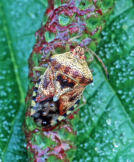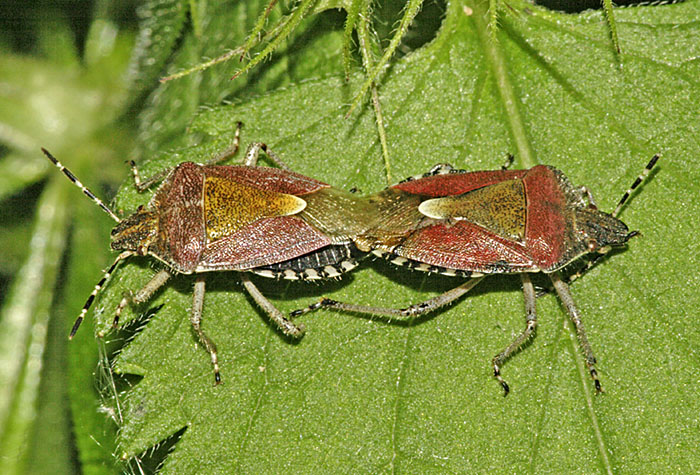 Bugs of one sort or another, Hemiptera and Heteroptera, are plentiful in woodland and shieldbugs are among the most easily seen as well as most endearing. This may be thanks to their variety of colouration and the apparently clumsy way virtually all of them fly and some of them move, especially when dropping out of sight off foliage when disturbed. Some are predators, some are not. Generally the group is doing well, with arrivals from mainland Europe and an But showing an adaptability matched by that of the Box Bug (see Gardens section), the Juniper Shieldbug has taken to using Lawson's cypress which, unlike the related Leyland Cypress, produces the cones the shieldbug requires. Stable species in numbers include the Forest Bug (Pentatoma rufipes, 14mm), found principally on Oak (Quercus sp), the Sloe Bug (Dolycoris baccarum, 11mm), which despite its name is not a specialist feeder and can be seen on many different plants, and the Dock Bug (Coreus marginatus, 13mm). The last-named, which breeds mainly on Docks and Sorrel (Rumex spp), is one of the commonest of all the group though it is not a genuine shieldbug. The robust antennae with four segments place it among the Coreidae or Squash Bug family. Parent Bugs (Elasmucha grisea, 8mm), which use Birch or Alder trees, are some of the most intriguing of the shieldbug family. Uniquely the female sits over her eggs and One Rhopaloid bug, Rhopalus parumpunctatus, is shown in the Heathland section but Rhopalus subrufus (7mm) is less particular in its requirements. Though commonest on chalk, it may be found in woodland rides and clearings or indeed anywhere with flower-rich grassy banks. Not all shieldbugs are herbivores and the Bronze Shieldbug (Troilus luridus, 10mm) resembles the Blue Shieldbug shown on the Downland invertebrates page in being a fierce predator. It is a fairly common species equally at home in broad-leaved and coniferous woodland, catching principally leaf beetles, although prey as tough as ladybirds can be taken. As the images above indicate, adults, which are seen mostly in August and September, are nothing like so colourful as the nymphs, whose brightness is perhaps the basis of the scientific name. Common Froghoppers (Philaenus spumarius) are bugs and capable of jumping The ground bug Aphanus rolandri (8mm) is a scarce, fast-running, sun-loving species active in a good year, notably 2005, from March to October. Ant Damsel Bugs (Himacerus mirmicoides, 8mm), which get their English name from the way the larva closely resembles an ant, are predators that eat almost anything smaller than themselves. This includes aphids, which helps give these insects a good name among farmers cultivating crops. Images © Jeremy Early. All rights reserved. In 2013 I published My Side of the Fence - the Natural History of a Surrey Garden. Details may be found, and orders placed, via this hyperlink My Side of the Fence. In November 2015 Surrey Wildlife Trust published the atlas Soldierflies, their allies and Conopidae of Surrey, jointly written by David Baldock and me. Details are on this web page: Atlas. |