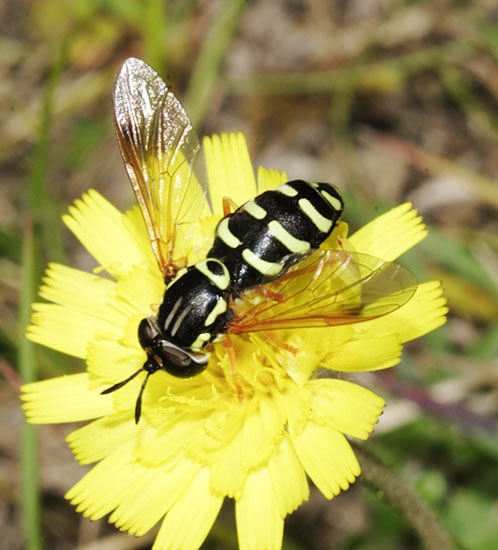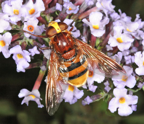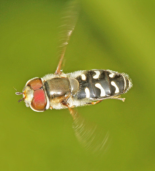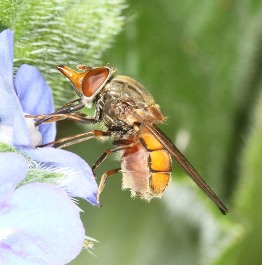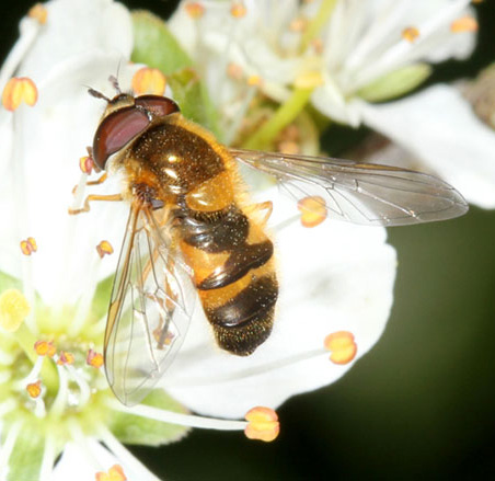 There are more than 6,700 species of fly in the UK, and with 270 species Syrphidae (hoverflies) form a pretty small fraction of the whole. Some, such as Criorhina ranunculi, which is shown on the Dead Wood page in this section, have a conservation designation due to their scarcity but there are plenty which are common. They are better known than most flies because of their often bright colouration, distinctive flight and habitual presence wherever there are nectar- and pollen-producing flowers, including in gardens. Different species, both as adults and larvae, feed on different organic matter ranging from dung to fungi via plants and other invertebrate larvae. A number are bumblebee or wasp mimics, which directly assists in the life cycle of a handful and gives some protecion to all against attack by predators. Most of the species shown on this page exemplify this. From the same genus as Criorhina ranunculi and commoner though still not exactly two a penny is Criorhina floccosa (16mm), a fine bumblebee mimic whose larvae develop in trees. The adults are seen mainly in June and July. Members of the Volucella tribe are large and obvious, with one exception mimicing Volucella bombylans (24mm) has two colour forms mimicing different bumblebees - bombylans and plumata. Volucella inanis (22mm), which is expanding its range northwards from the home range of the London area, is associated with Hornet (Vespa crabro) and German Wasp (Vespula germanica) nests. The impressive Volucella zonaria (35mm), a Hornet mimic and our largest hoverfly, has colonised Britain from Europe since 1940 and is spreading quite rapidly. Warmer climatic conditions are helping this development. The member of the clan which bears little resemblance to any aculeate is Volucella pellucens (22mm), with its distinctive black and white markings. Despite the seemingly unhelpful appearance, the larvae of this species reside in the nests of social wasps. The adults have a noted preference for bramble flowers. As a point of interest, in just a couple of days in June 2007 the relatively small section of a public park where the accompanying image was taken also saw three other types of Volucella, Criorhina floccosa and such aculeates as the bee Andrena florea, digger wasp Argogorytes mystaceus, cuckoo wasp Nysson spinosus and spider-hunting wasp Priocnemis perturbator. Leucozona lucorum (12mm), which has very similar markings to Volucella pellucens, is frequently found in lush vegetation. Xylota sylvarum (16mm) is a common and fairly large species whose larvae live in the decaying roots of beech or fir, while the chunky Myathropa florea (15mm), which peaks in August, lays its eggs near damp or rain-filled spots in trees. They are similar in markings to Eristalis species Baccha elongata (8mm) is a common hoverfly of woodland edge. The abdomen has an obvious waist and is unmistakeable. Helophilus pendulus (12mm) is the commonest hoverfly seen around wetlands but may be found in any habitat which has a wet element, including woodland. Noisy fliers, they are evident for much of the year but most frequent in July and August. The rat-tailed larvae have been found in shallow water, manure and wet sawdust. Callicera aurata (13mm) is a bonny and nationally scarce hoverfly, one with distinctive white tips to the antennae and a bronzy abdomen covered in golden hairs. The species is very sporadic in appearance but has been seen in plenty of locations and its larvae also live in water-filled cavities in trees. Epistrophe eligans (10mm) and Rhingia campestris (12mm) are commonly found on woodland edges. The latter, whose long snout assists it to nectar in deep flowers - the pictured example is on Penstemon in a garden - uses dung, principally from cows, for breeding. Its close relative Rhingia rostrata is less common and the breeding requirements are uncertain though there may be an association with Badger latrines. Another large species, Scaeva pyrastri (16mm), is principally a Chrysotoxum cautum (14mm) is the largest of the eight yellow-coloured members of the Chrysotoxum genus in Britain, all of which are good wasp mimics, and is easily identified in the field by its markings and broad abdomen as well as size. Scrubby areas with grass and/or trees suit this one as well as Chrysotoxum festivum (12mm) and Chrysotoxum bicinctum (12mm). These species are all on the wing from May to September and visit a wide range of plants for nectar, a comment that applies equally to Xanthogramma pedissequum (12mm), though this species does tend to fly and forage closer to the ground. Larvae are associated with nests of Lasius sp ants. Finally, Ferdinandea cuprea (11mm), which is widespread and distinctively marked but is noticed less than many species because it tends to rest and bask on wood or leaves rather then on flower heads. The pictured female was a useful exception to this rule. Cheilosia is the most numerous hoverfly genus in Britain and the tally has increased in recent times with the arrival from mainland Europe of Cheilosia caerulescens (10mm). The larvae of this species eat House Leeks so it is a rare example of a hoverfly that can be a nuisance for gardeners. The bumblebee mimic Cheilosia illustrata (12mm), a more colourful species than most Cheilosias, is not infrequent. The best place to look is on Hogweed flower heads. Eristalis intricarius (12mm) is another bumblebee mimic and one that is widespread, often found in dampish habitats. Didea fasciata (12mm) and Sericomyia silentis (14mm) are each a fair size and somewhat less common. Images © Jeremy Early. All rights reserved. In 2013 I published My Side of the Fence - the Natural History of a Surrey Garden. Details may be found, and orders placed, via this hyperlink My Side of the Fence. In November 2015 Surrey Wildlife Trust published the atlas Soldierflies, their allies and Conopidae of Surrey, jointly written by David Baldock and me. Details are on this web page: Atlas. |