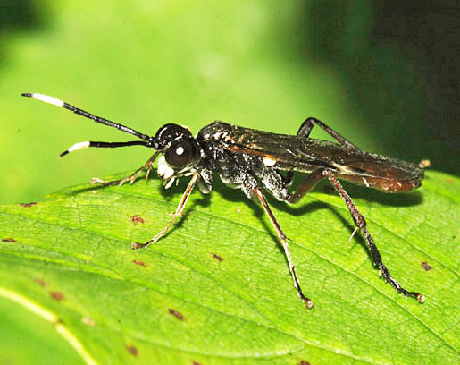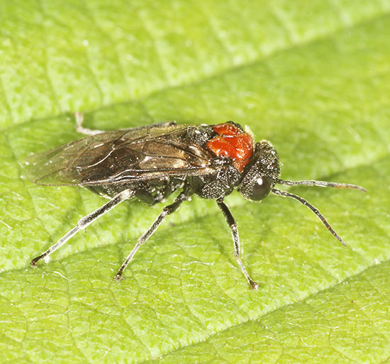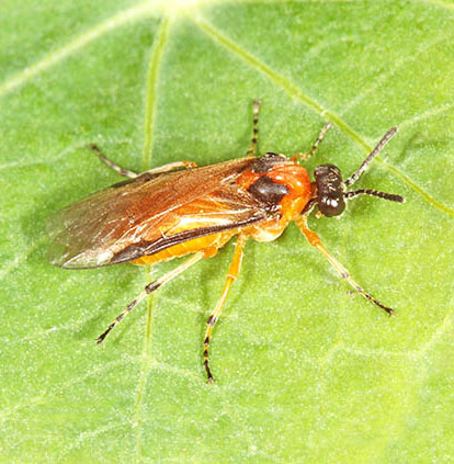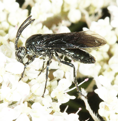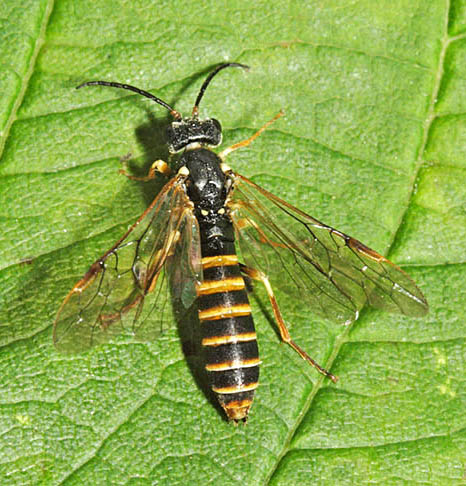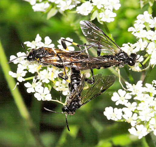 The Hymemnoptera superfamily contains many more species than just ants, bees and wasps. Ichneumon wasps, the most numerous of all, are dealt with on a separate page but here are just a handful of sawflies, of which there are more than 500 species in Britain. As with Ichneumons, identification is rarely easy. Many of them are striking in appearance, often as wasp mimics though lacking the 'wasp waist'. Others, including the Apple sawfly (Hoplocampa testudinea), Turnip Sawfly (Athalia rosae) and Gooseberry Sawfly (Nematus ribesii), are regarded as pests because of the damage the larvae do to the leaves of fruit trees and bushes plus garden plants. Tenthredo maculata (16mm) and Tenthredo celtica (12mm) are superb wasp mimics from the Tenthredinidae family, the largest family numerically by some margin. The adults are common between May and late summer and frequently nectar on Umbellifers. Umbellifers in fact attract many types of sawfly and males often patrol the flowers in search of mates, as with the group of two males and one female of a Tenthredinidae species shown above. The dashing green colouration makes Rhogogaster punctulata (11mm) one of the brightest of the Tenthredinidae. The adults are predatory. Bracken feeders are not that common among our invertebrates but three sawflies shown here are in the list. Strongylogaster multifasciata (15mm) is another fine wasp mimic and the same goes for Strongylogaster xanthocera (15mm). Like many species, they tend to bask. The other bracken feeder, Aneugmenus coronatus, is smaller at 7mm. Tenthredo mesomelas (11mm) has plenty of green marking. Larvae feed nocturnally on buttercup among various plants. Tenthredo livida (12mm) is seen quite frequently between May and August. The markings involve a white lower face and white on the antennae plus red on the abdomen. Larvae feed on such plants as hazel, willow and honeysuckle. Two of the least popular species must be the Turnip Sawfly (Athalia rosae, 9mm), which attacks cruciferous plants as a larva, and the Rose Sawfly (Arge pagana, 9mm) whose larvae can cause considerable damage to rose bushes, as the image above shows. They both stand out with their orange colouring and both spend a lot of time on flower heads as adults. The Bramble Sawfly (Arge cyanocrocea, 8mm) is from the same genus and is distinguished by the dark marks on the wings. The Berberis Sawfly (Arge berberidis, 8mm) is less striking than the other Arge species shown here but does have an attractive blue tinge. This one is fairly new to Britain and besides Berberis it targets Mahonia, leading to no great joy at its presence in gardens. Another rose feeder is Allantus truncatus (12mm), a widespread species with adults occurring from May to August. The Alder Sawfly (Eriocampa ovata, 9mm) is distinctive with its red-orange thoracic markings and the Hazel Sawfly (Croesus septentrionalis, 11mm) bears a striking resemblance to some spider-hunting wasps. Willow Wood Wasp Xiphydria prolongata (14mm) is also from the Hymenoptera superfamily. This is part of a family led by the massive Greater Horntail (Urocerus gigas), which can measure over 40mm. All Wood Wasps use their sizeable ovipositors to lay eggs in wood and the larvae feed within the tree. The illustrated species is known to use Poplars, Willows and Elms. Images © Jeremy Early. All rights reserved. In 2013 I published My Side of the Fence - the Natural History of a Surrey Garden. Details may be found, and orders placed, via this hyperlink My Side of the Fence. In November 2015 Surrey Wildlife Trust published the atlas Soldierflies, their allies and Conopidae of Surrey, jointly written by David Baldock and me. Details are on this web page: Atlas. |