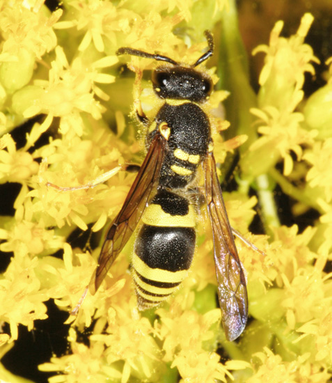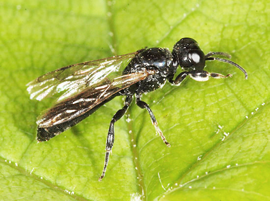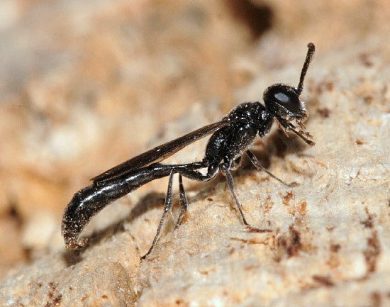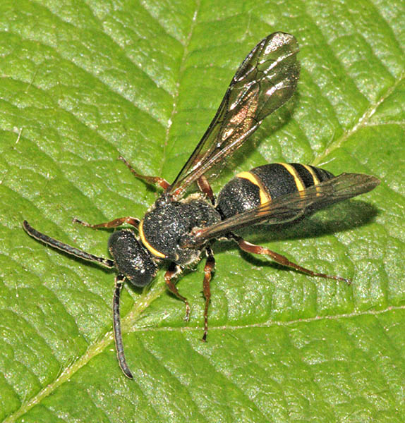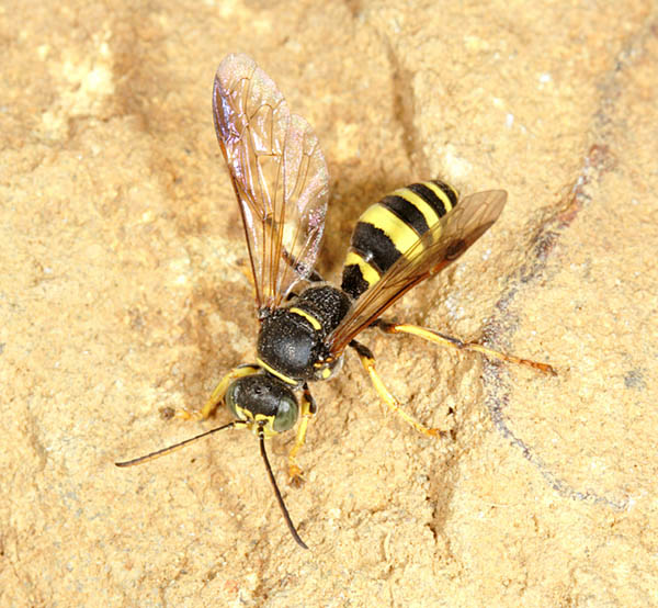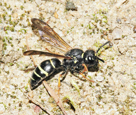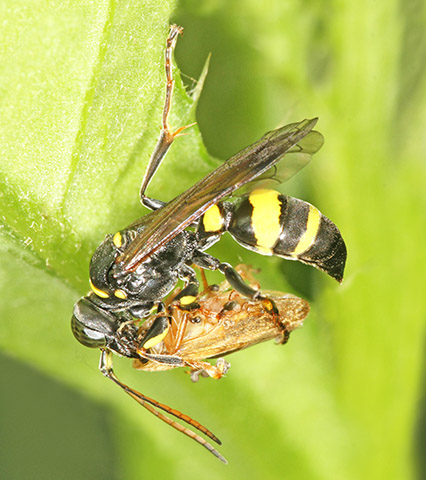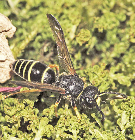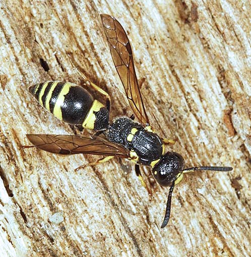 There is no shortage of wasps in woodland, with many making their nests in timber. Those which I have seen and photographed nesting in the garden, including Ancistrocerus nigricornis and Ectemnius cavifrons, are included on that page and on the Bees & Wasps in flight page. Ectemnius rubicola (10mm) is similar to Ectemnius continuus but slightly smaller and less frequent. It is the only member of the genus which nests in plant stems, such as thistles and brambles, rather than dead wood. Ectemnius dives (12mm), another dead wood nester, was a 20th century arrival in Britain and has spread quite effectively. Argogorytes mystaceus (14mm) prey on spittle-bug (Homoptera sp) nymphs, up to 27 of which are deposited in each cell dug within a 10cm burrow in dry banks in woodland glades. Males have the longest antennae proportionately to their bodies of any Sphecid wasp. A fairly common cuckoo wasp which bears a passing resemblance to Argogorytes mystaceus preys upon that wasp. The cleptoparasite, which lays an egg in one or more cells, is called Nysson spinosus (10mm) and can be seen, albeit not often for any length of time, skulking around the dense vegetation that suits the host Lestiphorus bicinctus (13mm) is a scarce species found in various locations on light soils, including parkland and woodland clearings but also heathland and coastal dunes. They prey on bugs which are placed in a burrow dug in the soil. The equally scarce wasp Nysson trimaculatus (9mm) cleptoparasitises Lestiphorus bicinctus and two other scarce wasps, Gorytes laticinctus, shown in the Heathland section of this website under Sandpits, and Gorytes quadrifasciatus. There are more than 20 Crossocerus species in Britain and the majority have entirely black abdomens. Crossocerus binotatus (11mm) is one of just a handful with yellow markings and is far from common nationally. They nest in dead wood, as does perhaps the chunkiest of the genus, Crossocerus megacephalus. This catches a wide variety of Diptera as food for its grubs. The pictured female was nesting in mid-October 2007, much later than usual for the species, which is usually seen up to the end of August. Uncommonly she was also nesting within a short distance of two Crossocerus pusillus, a sand-burrowing member of the genus, since her burrow was in a remnant root on a root-plate rather than in a stump, log or post. Other wood-nesting members of the genus include Crossocerus cetratus (7mm), which preys mainly on small Diptera, Crossocerus podagricus (7mm), which also catches Diptera, and Crossocerus congener, a smaller version of Crossocerus podagricus which is scarce throughout its international range. The first UK specimen was found in Hertfordshire in 1999 since when there have been only a handful more found, including the pictured female at Reigate Heath SSSI in Surrey in June 2008. Three other black wasps are led by Pemphredon rugifera (6mm), which is a Red Data Book species. They have an odd distribution across the UK, with most sightings in eastern Scotland and south-east England. Not that that there have been many sightings anywhere - the female shown here from 2007 was only the third found in Surrey in the last 60 years. The Scottish connection has led to the suggestion that Pemphredon rugifera may be associated with Scots Pine (Pinus sylvestris) but this is probably mere coincidence. Pemphredon species are among those falling prey to the Ichneumon wasp Perithous scurra. The minuscule Nitela lucens (4mm) is also a rarity. They have their antennae set very low on the face and have a very sporadic coverage in southern England. Certain wasps which hunt spiders but are not from the Pompilidae family are found in woodland and marginal areas, notably the Trypoxylon genus. Trypoxylon medium is focused on in the Heathland pages and Trypoxylon clavicerum in the garden section, which leaves just one species that is distinguished from its peers by having a very long first section ('tergite') to the abdomen. Trypoxylon attenuatum (8mm) is the species. The whole Trypoxylon tribe is noted for engaging in nest usurpation, an action which makes sense given the time and effort involved in nest construction and foraging by solitary female aculeates of all species. In July 2007 I witnessed an attempted usurpation by a female Trypoxylon attenuatum.