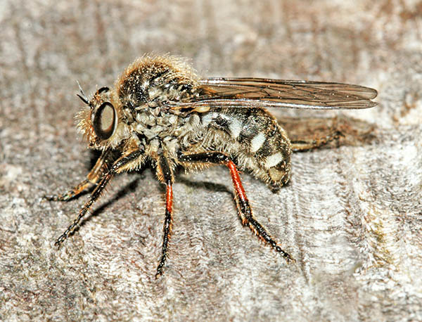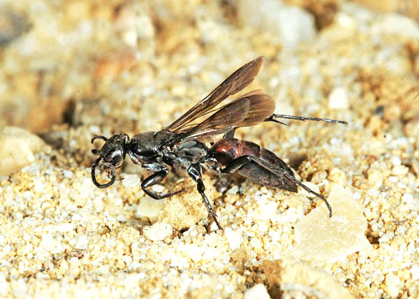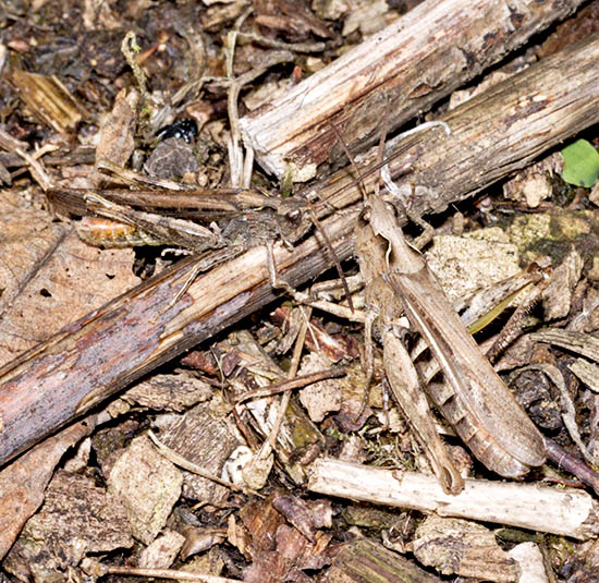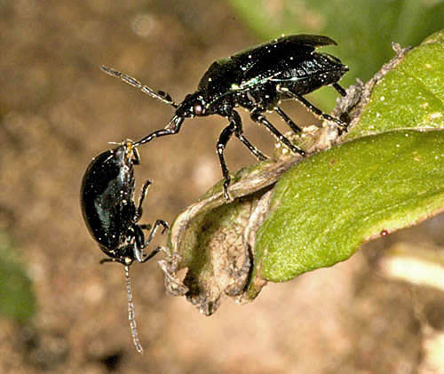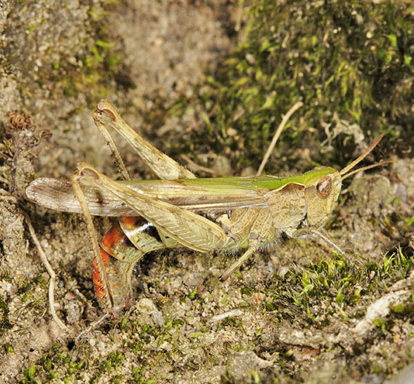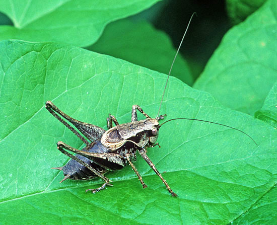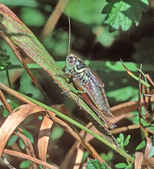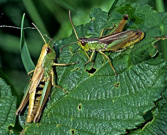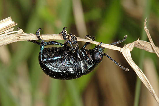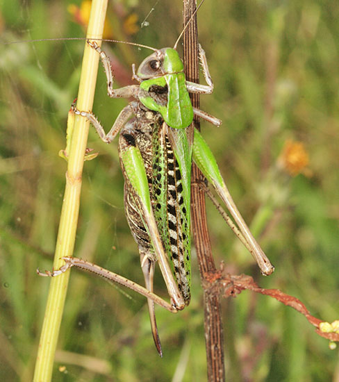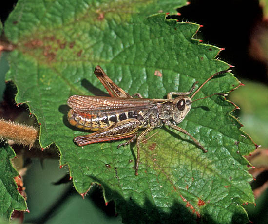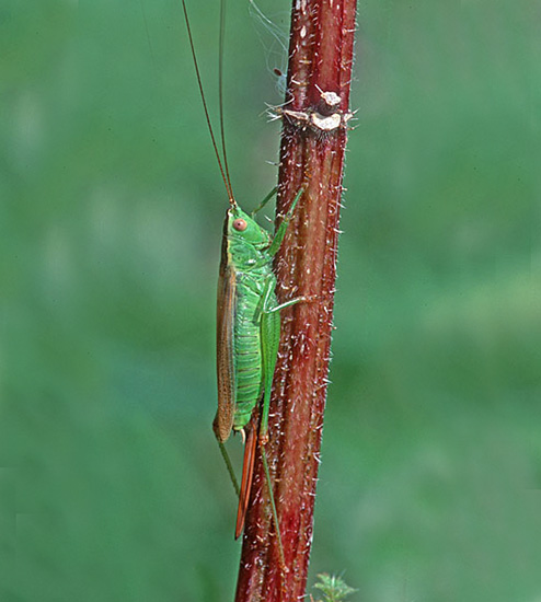 Orthoptera (35 species of grasshoppers, crickets, earwigs and cockroaches in Britain) have an excellent niche on downland. Dorset and Hampshire are the best counties for the group but Surrey is not far behind and recruitment of new species is better with this group than almost any other as three types of bush-cricket have expanded across the region. The largest British cricket, the Great Green Bush Cricket (Tettigonia viridissima, 70mm), is suited by scrub on calcareous grassland but may be found in other habitats. It is a species of southern England and mostly near the coast. Great Green Bush-crickets can fly well and the male's 'song' is lengthy and loud. However, the uniform colouring ensures that the species is always well camouflaged in grass and not that easy to find even when stridulating. One of our largest crickets, the Wart-biter (Decticus verrucivorus, 35mm), is a species of calcareous grassland and designated as vulnerable, with colonies in East Sussex, Dorset, Wiltshire and Kent (a reintroduction). It is the subject of a Biodiversity Action Plan. Populations tend to be small in most instances, with 50 or fewer adults, and are found on south-facing slopes where eggs are laid in bare soil or short turf and spend two winters underground. The Wart-biter is declining in much of its European range too. Food includes plants One of the commonest grasshoppers is the Meadow Grasshopper (Chorthippus parallelus, 18mm), shown on Fragrant Orchid on the previous page. When courting, males follow the usual method of stridulating (rubbing the hind legs against the forewings to make a chirping song) so familiar to anyone who walks across the downs. As can be seen from the image, this may occur very close to the female. All species have a different song. Meadow grasshoppers, like all others, are herbivores and tend to need longer and damper grassland than some species, as egg-laying occurs only in moist soil. Even so, they are common enough on downland. Field Grasshoppers (Chorthippus brunneus, 20mm) are exceptional fliers that can take to the air for up to 50 metres. Their colour is variable, with individuals showing straw, buff, brown, green or purple. The song is loud and the female lays eggs only in dry soil including, from my observations in 2004, within a tree root-plate. One species which is found almost entirely on south-facing calcareous grassland in Britain and is nationally scarce is the Rufous Grasshopper (Gomphocerippus rufus, 15mm). Adults appear relatively late, from August to November in warm years, and they are readily separated from other Orthoptera by having clubbed antennae with a white tip. The North Downs are a stronghold. One significant distinction between grasshoppers and bush-crickets is the considerable length of the latter's antennae. Another is that male bush-crickets stridulate solely with the forewings. They are partly carnivorous and some are active at night. The Dark Bush-cricket (Pholidoptera griseoaptera, 22mm) is decidedly common and found in almost every habitat, especially those with brambles or marginal vegetation. They are active during the day and the male has small wings. However, Roesel's Bush-cricket (Metrioptera roeselii, 18mm), equally chunky though slightly shorter, is the name of this newcomer, which has a very noisy, buzzing song. In 1940 they were restricted in the south to the Thames Estuary but now they are present in virtually all lowland England. A long-winged form is common in hot summers, which helps dispersal of the species. Tall weeds and rough grassland, including on set-aside land, suit it admirably, and with this habitat increasing - an index often of lack of proper management - its prospects of further expansion look good. The Long-winged Conehead (Conocephalus discolor, 18mm) was first found in England in 1931 and is now widespread, assisted by being able to fly powerfully and breed prodigiously. Strong flight is a disadvantage for individuals if orb-web spiders such as the Cross Spider (Araneus diadematus, body to 15mm) are present in numbers. Another spreading species, the slightly smaller Short-winged Conehead (Conocephalus dorsalis), is less able to cope with dry habitats and hence is not located in so many places. One shieldbug found almost exclusively on chalk downland is the Tortoise Bug (Eurygaster maura), which is nationally notable. Commoner and found on downland but also in plenty of other habitats is the related Tortoise Bug (Eurygaster testitudinaria, 10mm). A translation of the scientific name is Tortoise-like Fatbelly, not a title likely to endear the insect to the public at large. Unlike its relative, it is increasing in numbers quite dramatically. Another shieldbug found on downland, though also on heathland, is the tiny Blue Shieldbug (Zicrona caerulea, 7mm), which changes from red to blue as the nymph becomes an adult. They are snappy in action as well as appearance, preying on flea-beetles A notable fly found pretty well exclusively on chalk grassland in lowland England is the Slender-footed Robberfly (Leptarthrus brevirostris, 10mm). A scarcer species from the same genus is also found in this habitat, Leptarthrus vitripennis.The conopid fly Thecophora atra (7mm) is a parasitoid mainly of the solitary bee Lasioglossum morio and is recorded more from chalk than any other substrate. A beetle which is not specific to downland but is ideally suited by the profusion of grass found in that habitat is the Bloody-nosed Beetle (Timarcha tenebricosa, 9mm). Our largest leaf beetle, it is flightless, feeds on bedstraws and herbs and obtains its colloquial name from the habit of releasing a drop of red fluid from the mouth to deter predators when alarmed. The same comments about habitat apply to the Wasp Spider (Argiope bruennichi, 13mm female), which is a fine mimic that's commonplace in Europe and is increasing its range in Britain, where it was first found in 1922. Males are only about a third of the size and much drabber